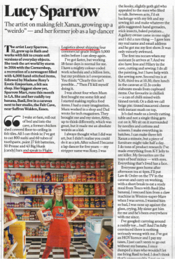 Having  delivered 7 tons of felt art to L.A. we were delighted to get a mention in the Sunday Times interview with Lucy Sparrow – creator of all things felt and “Sparrow Mart”. Following a complete sell out in New York earlier this year Lucy created a new show for Los Angeles and the good people of L.A. are currently queuing around the block each day to view and purchase her highly collectable pieces of art !