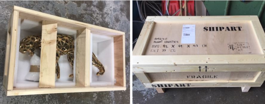 Custom crating – Richard Orlinski’s resin sculpture “Panther”, packed and ready to ship to Lebanon – with ShipArtTM stamp
