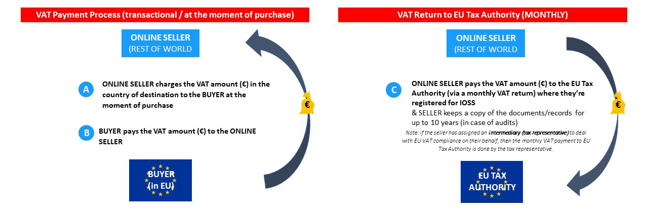 - The online seller can assign an intermediary (tax representative) to deal with EU VAT compliance on their behalf, i.e. to pay the VAT amount to the EU Tax Authority (via a monthly VAT return).