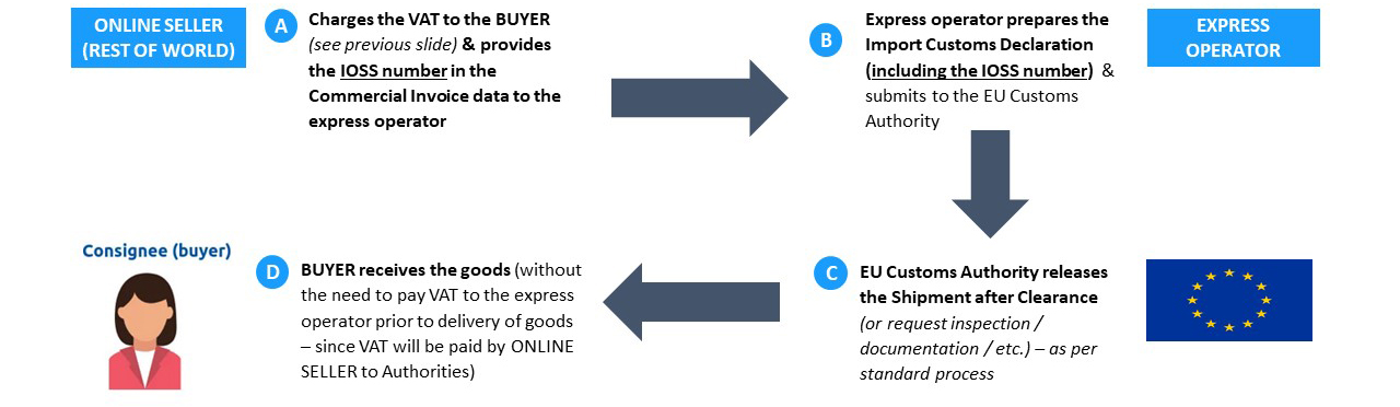 - The express operator will then include the IOSS number in the Import Customs Declaration submission to the EU Customs Authorities – below an overview: